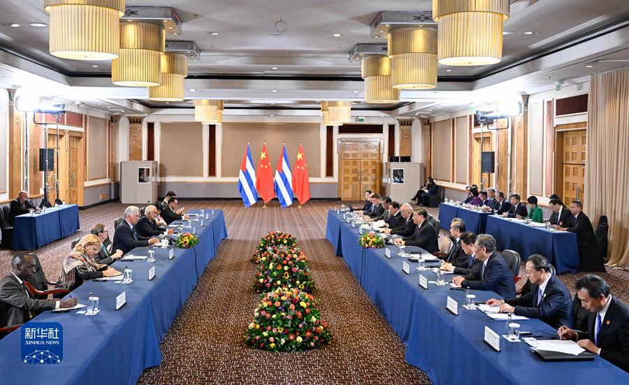 习近平指出,去年11月,主席同志成功对中国进行国事访问,我们就持续深化新时代中古关系达成广泛共识,一致同意携手共建中古命运共同体。在双方共同努力下,这些共识正得到很好落实。中方愿同古方不断深化政治互信,拓展务实合作,密切战略协作,推动中古两党两国特殊友好关系不断得到新发展。中方高度赞赏古方在涉及中国核心利益问题上始终坚定支持中方,将继续坚定支持古巴捍卫国家主权、反对外来干涉和封锁,并尽力为古巴经济社会发展提供支持。
