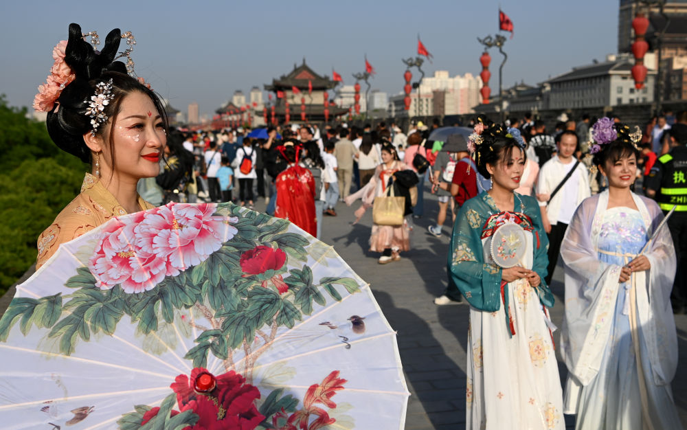 游客在西安城墙景区参观游览。(2023年4月30日摄)。新华社发(邹竞一摄)