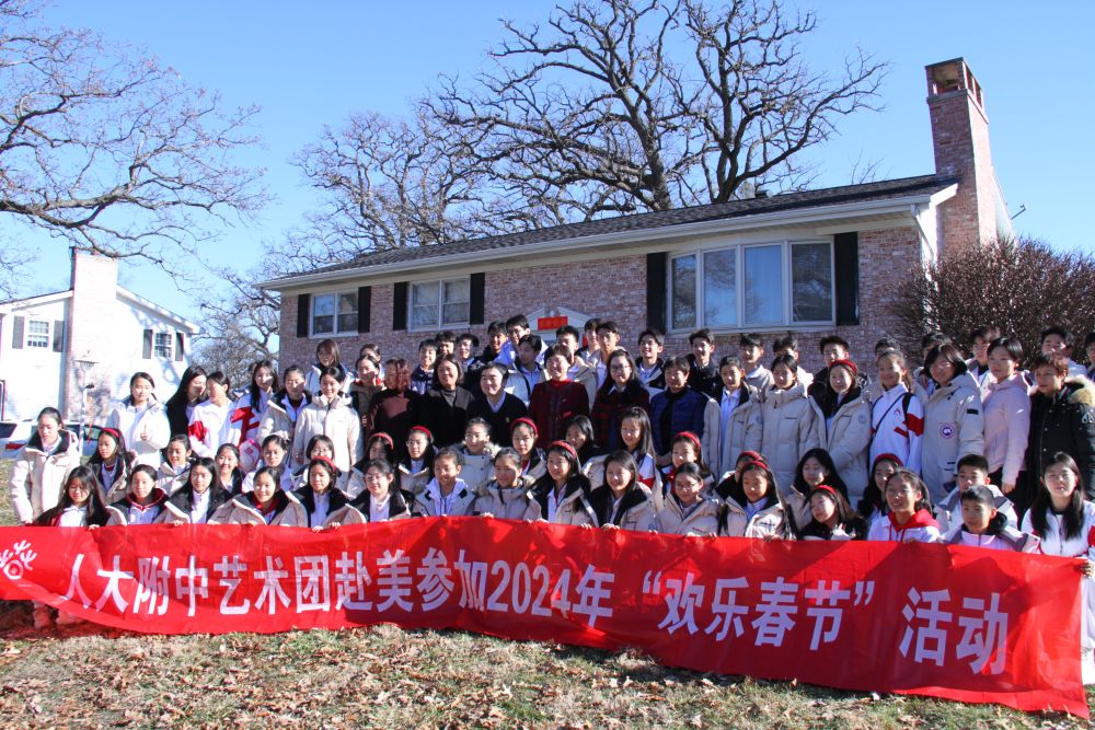 2月9日,在美国艾奥瓦州马斯卡廷,人大附中艺术团在“中美友谊屋”前合影。