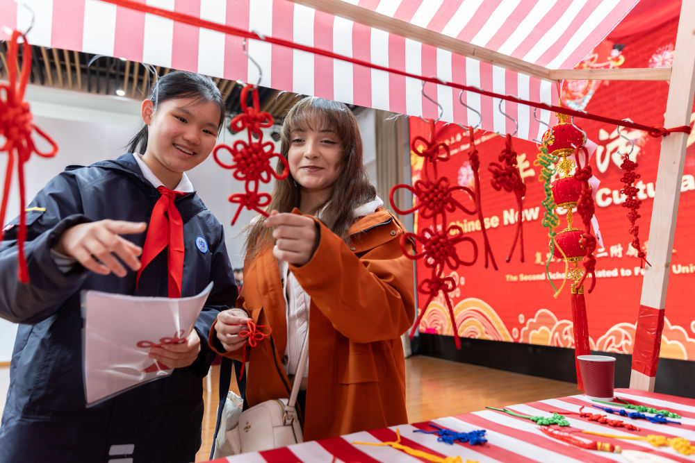 1月28日,复旦大学第二附属学校学生(左)为马斯卡廷学生(右)介绍中国结。
