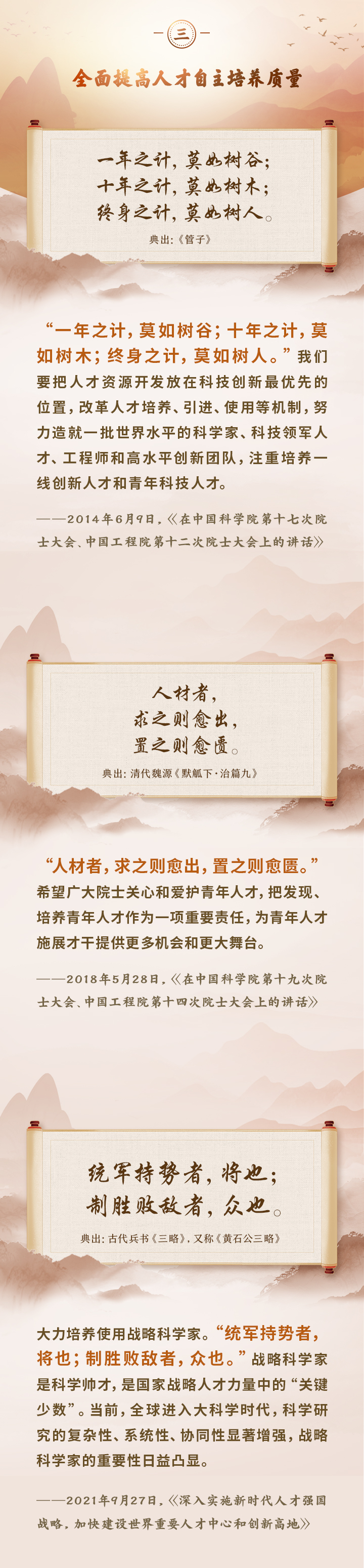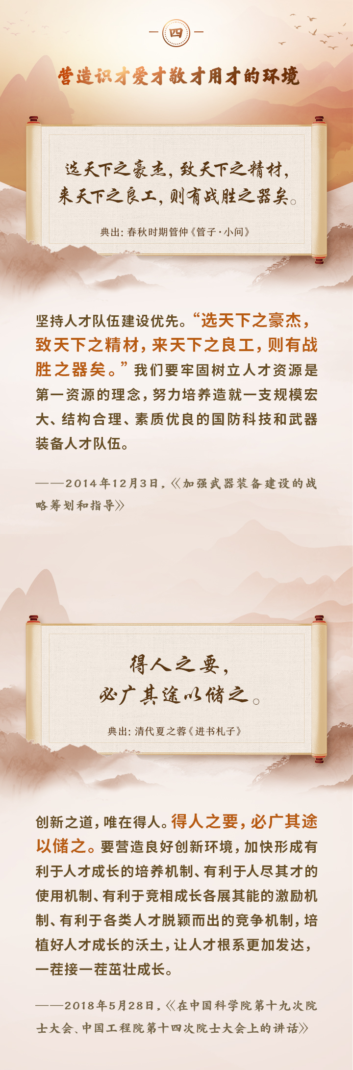 编者按:培养造就大批德才兼备的高素质人才,是国家和民族长远发展大计。党的十八大以来,习近平总书记围绕人才工作发表一系列重要论述,立意高远,内涵丰富,思想深刻,深刻回答了为什么建设人才强国、什么是人才强国、怎样建设人才强国的重大理论和实践问题。在这些重要论述中,总书记精妙运用古代典籍、经典名句,以古喻今、启迪思想、激荡精神,让我们一起来学习!