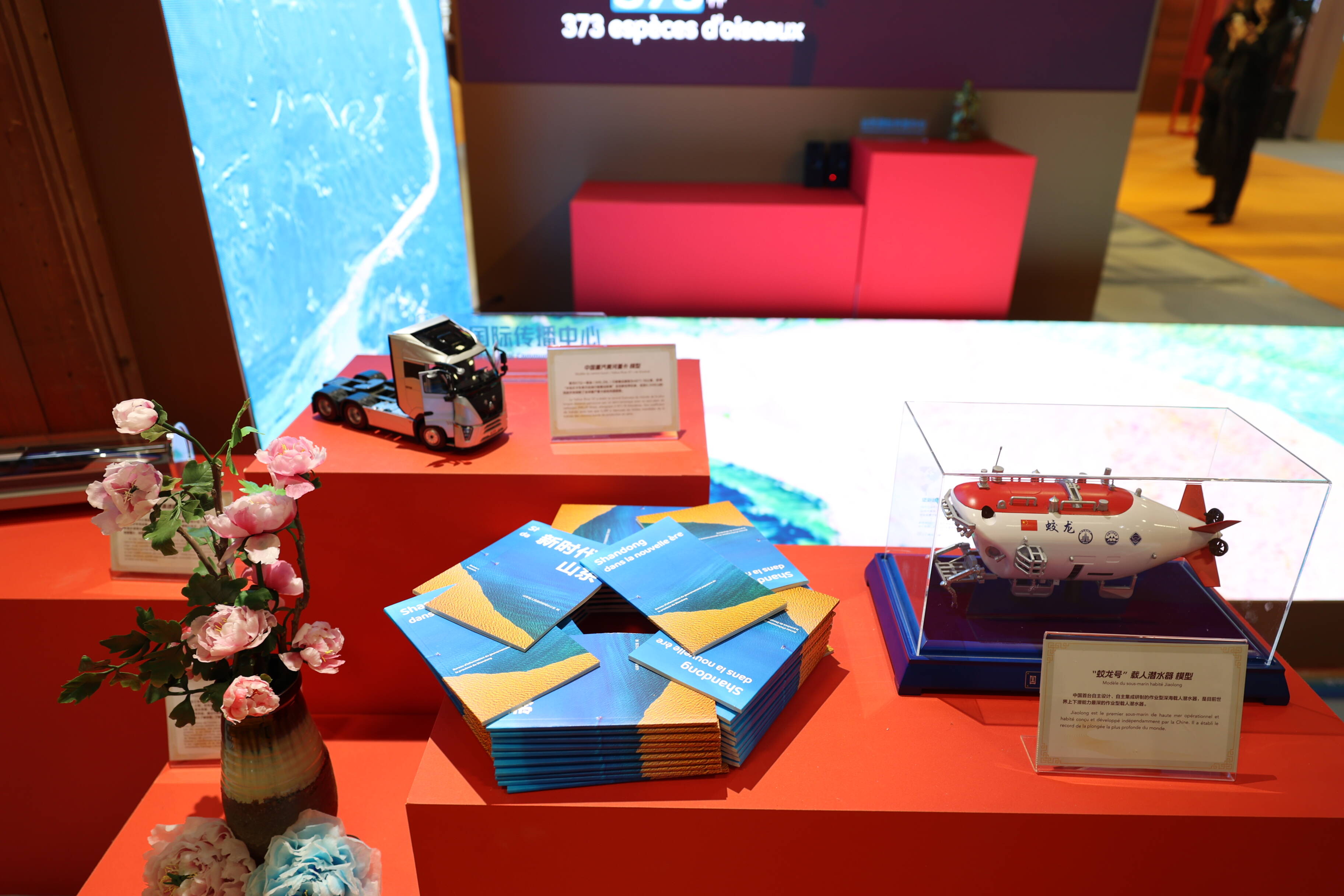 近年来,山东全力打造“好客山东 好品山东”区域公共品牌。此次黄河文化展专门展出了不少山东好品,既有“蛟龙号”载人潜水器模型、中国重汽重卡模型等大国重器,也有博山琉璃凤凰孔雀瓶、螺钿漆器、菏泽牡丹等非遗手造产品。此外,还联合沿黄九省区展示沿黄九省(区)的标志性非遗、文创产品,如青海青绣荷包、四川银花丝蝴蝶吊坠、甘肃天水雕漆首饰盒等,向海外观展游客展示黄河文化的独特魅力。
