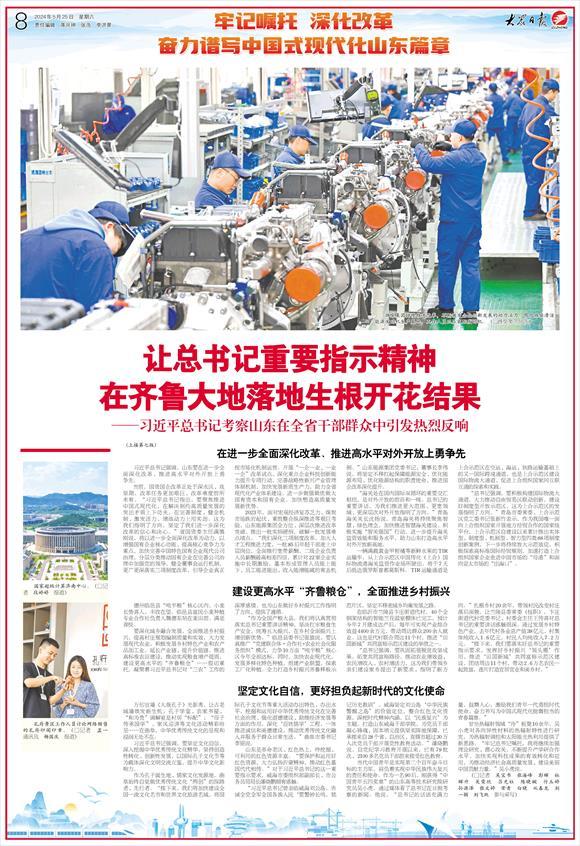 “习近平总书记的重要讲话激荡人心、催人奋进!”山东广大干部群众一致认为,在进一步全面深化改革的历史关头,在以中国式现代化全面推进强国建设、民族复兴伟业的关键时期,习近平总书记再次亲临山东考察调研,为新征程上推进社会主义现代化强省建设指明了前进方向,提供了根本遵循,凝聚起磅礴的奋进力量,极大鼓舞和激励了全省干部群众。大家表示,一定牢记殷殷嘱托,不负如山厚望,沿着总书记指引的方向不懈奋斗、勇毅前行,稳扎稳打、踏踏实实,坚定扛起新使命、展现新气象、实现新作为。