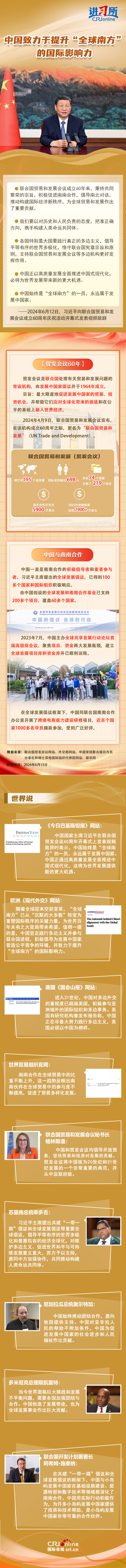 6月12日,中国国家主席习近平向联合国贸易和发展会议成立60周年庆祝活动开幕式发表视频致辞时强调,中国正以高质量发展全面推进中国式现代化,必将为世界发展带来新的更大机遇。