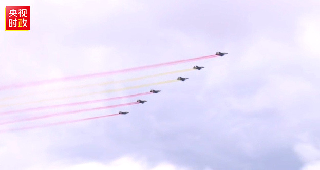 习近平主席车队抵达哈萨克斯坦总统府时,六架哈萨克斯坦空军战机从总统府上空飞过,拉出象征中国国旗的红黄色彩带,以最高礼仪欢迎习近平主席。