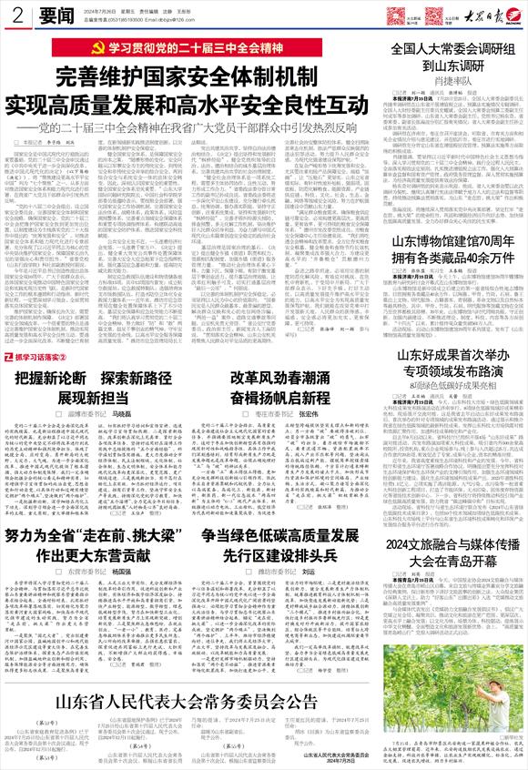 以完善的体制机制护安全保稳定,必须坚持以人民为中心的价值取向。“国泰民安是人民群众最基本、最普遍的愿望,解决群众反映和关心的电信网络诈骗、‘两抢一盗’案件、道路交通事故等问题,公安机关责无旁贷。”省公安厅党委委员、政治部主任、新闻发言人王海防说,“贯彻落实全会精神,山东公安机关将聚焦人民群众对平安品质的更高期待,完善社会治安整体防控体系,健全扫黑除恶常态化机制,依法严惩群众反映强烈的违法犯罪活动,努力提升人民群众安全感,为现代化强省建设保驾护航。”