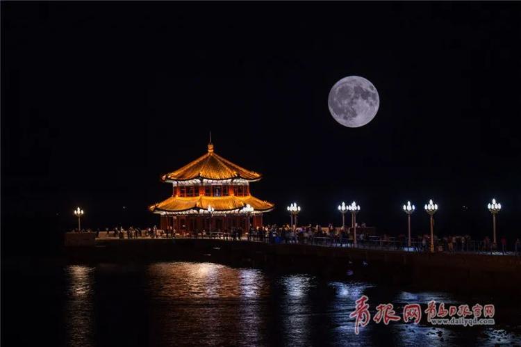 图为青岛栈桥附近二次曝光后的圆月。图片来源:青岛新闻网(“青岛观”摄影师王华 摄)