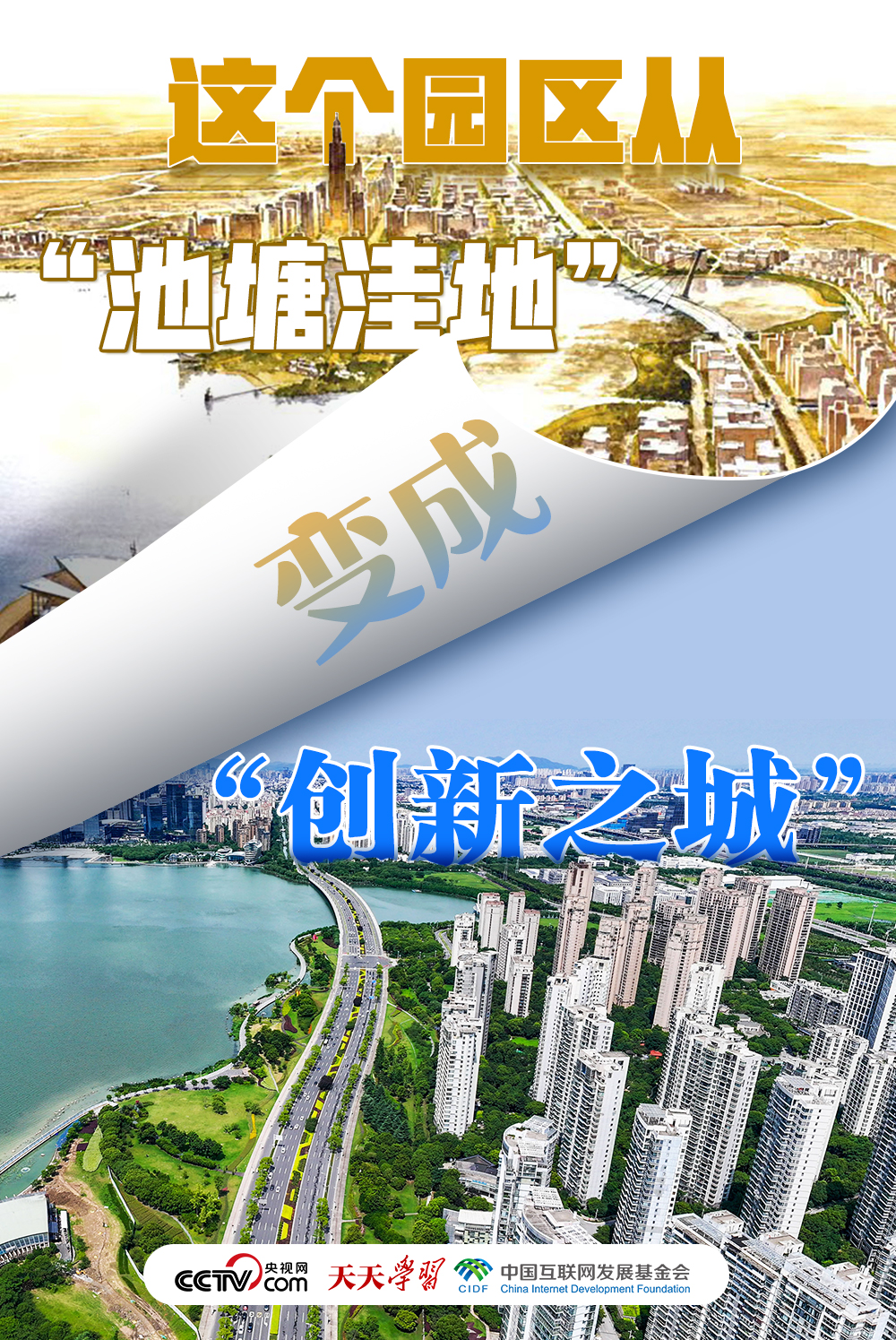 拼版照片:上图为1994年绘制的苏州工业园区规划图;中图为2007年拍摄的苏州工业园区;下图为2023年7月4日用无人机拍摄的苏州工业园区。