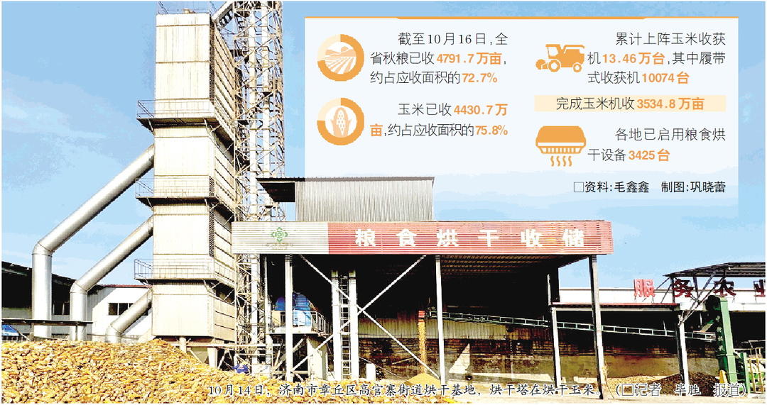 10月14日,济南市章丘区高官寨街道烘干基地,烘干塔在烘干玉米。(□记者毕胜报道) □资料:毛鑫鑫制图:巩晓蕾