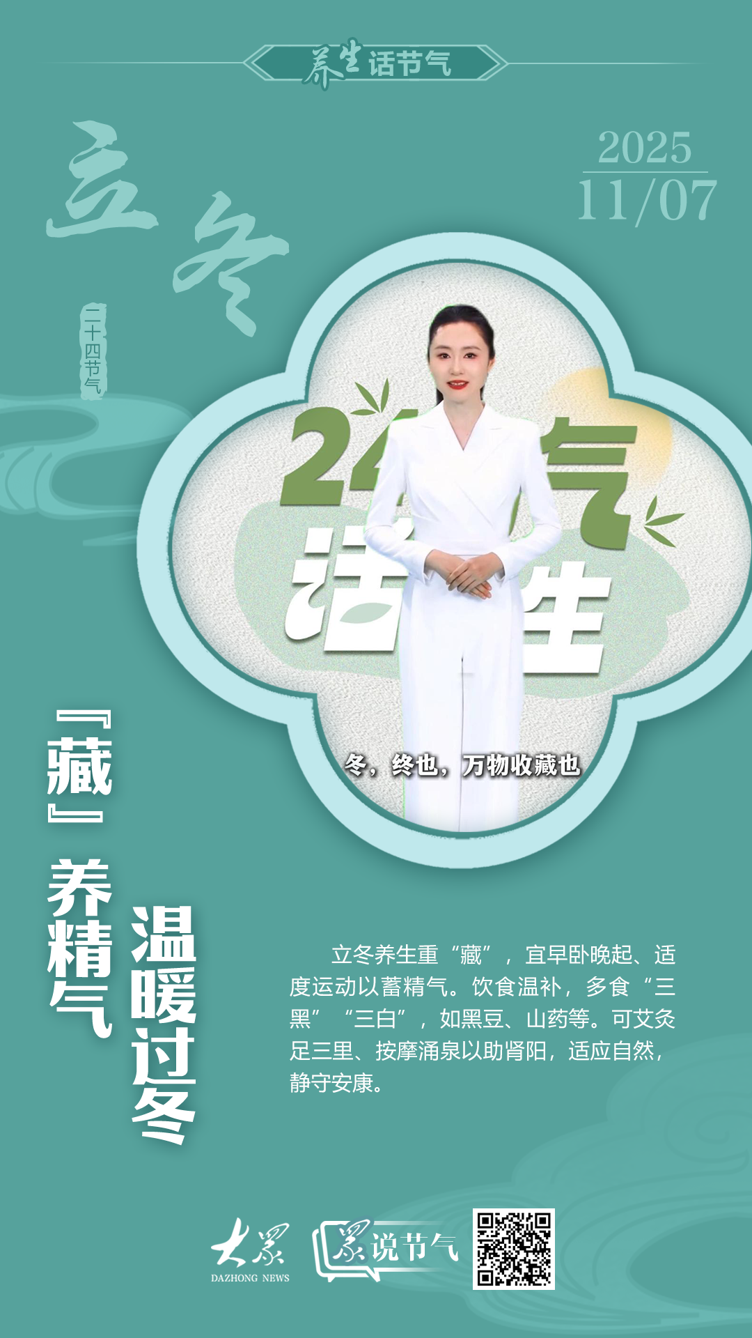 “冬,终也,万物收藏也。”立冬,万物进入休养、收藏状态。此时阳气潜藏,当补肾填精,养生重在养肾。