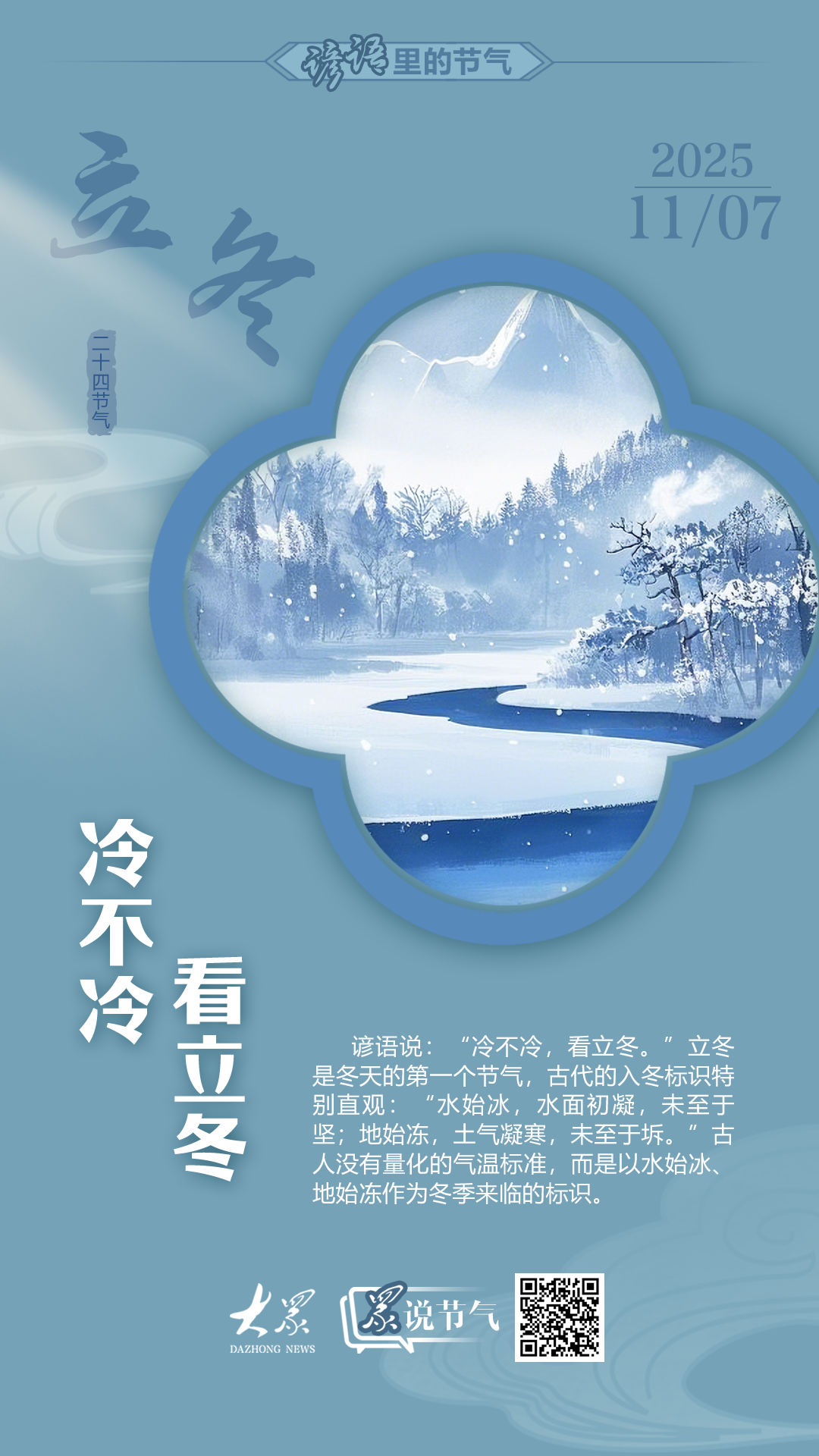 谚语说:“冷不冷,看立冬。”立冬是冬天的第一个节气,古代的入冬标识特别直观:“水始冰,水面初凝,未至于坚;地始冻,土气凝寒,未至于坼。”古人没有量化的气温标准,而是以水始冰、地始冻作为冬季来临的标识。