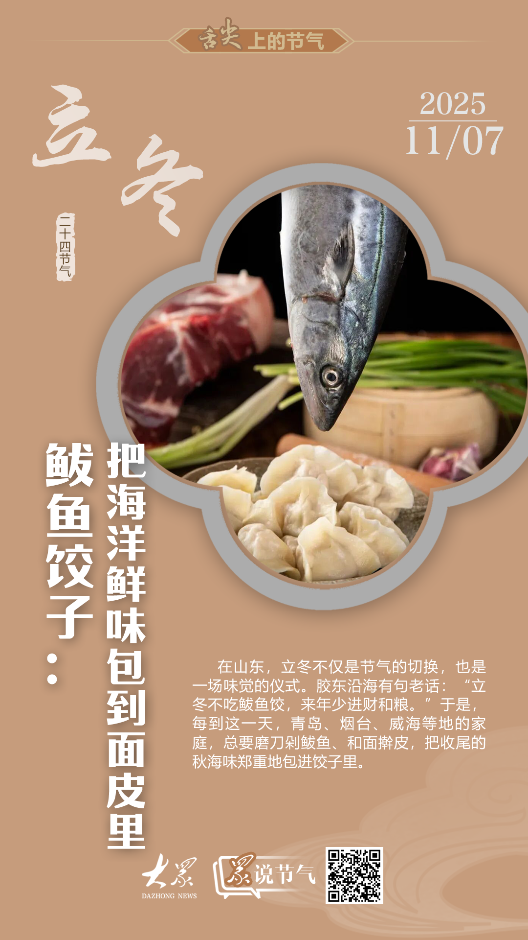 在山东,立冬不仅是节气的切换,也是一场味觉的仪式。胶东沿海有句老话:“立冬不吃鲅鱼饺,来年少进财和粮。”于是,每到这一天,青岛、烟台、威海等地的家庭,总要磨刀剁鲅鱼、和面擀皮,把收尾的秋海味郑重地包进饺子里。