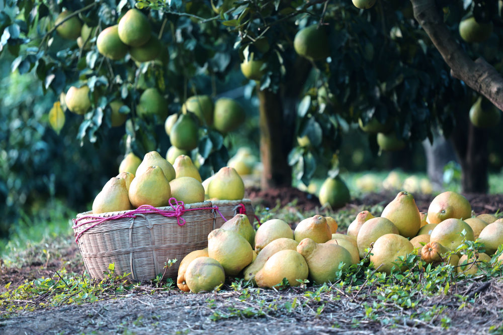 2025年11月7日,柚农在梅州南福金柚种植基地采摘柚子。