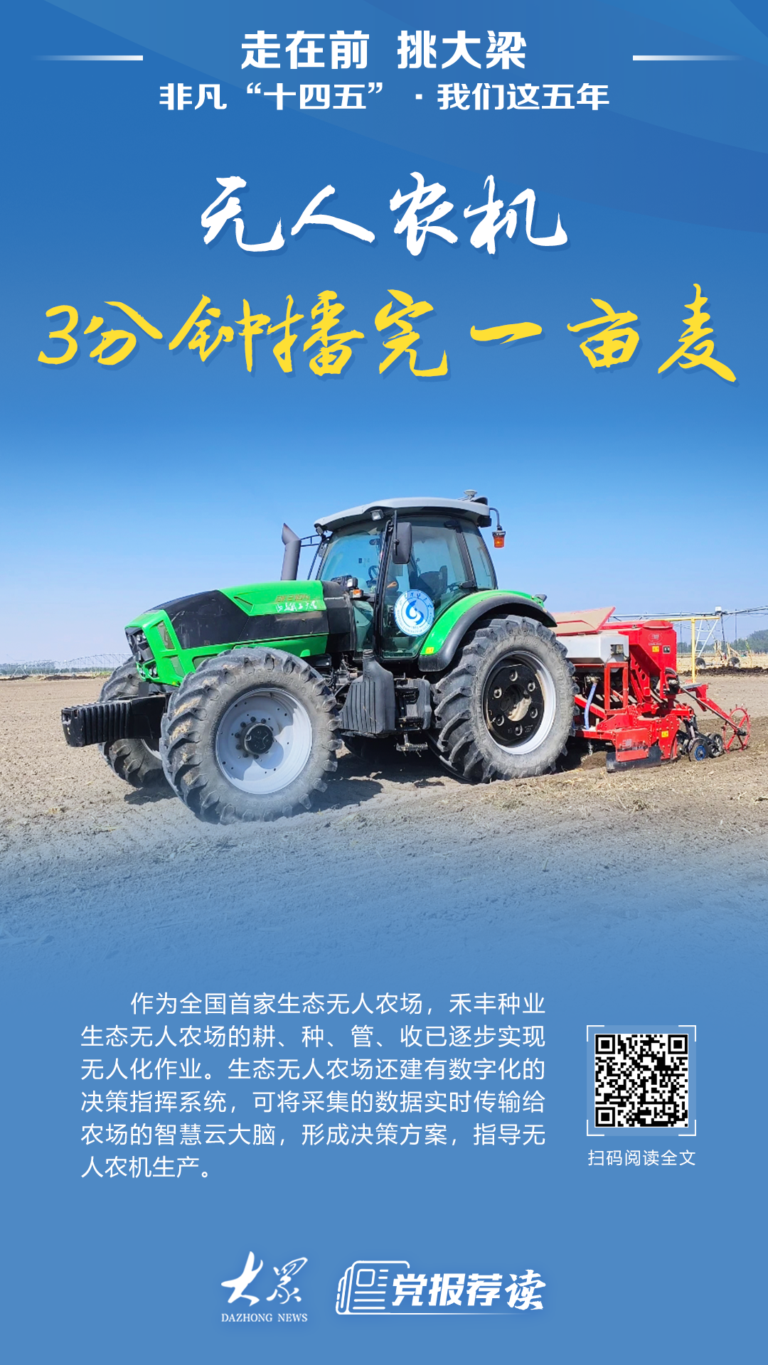 “无人农机采用卫星导航,播种一亩地仅需3分钟,百米作业精准度可达2.5厘米以内。”农场工作人员介绍。