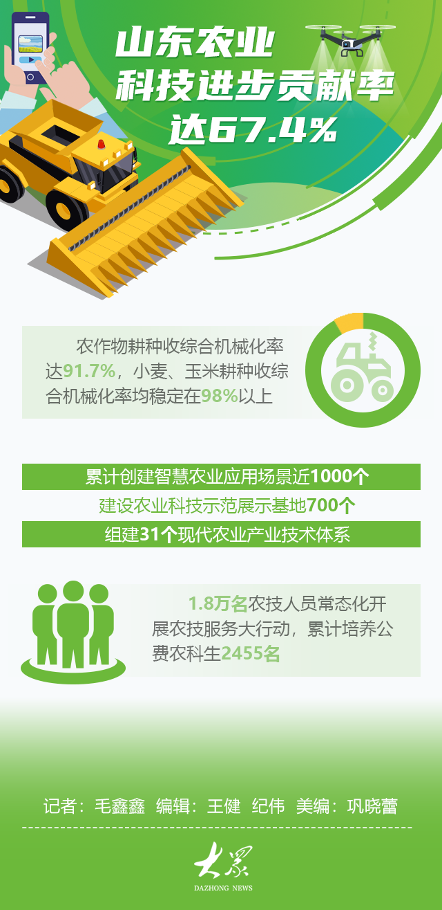 近年来,山东以科技创新和数字建设为关键支撑,赋能农业农村发展。在科技创新方面,突出抓好农业科技领军企业培育,遴选建立1000家科技企业库,强化智能农机装备研发推广,全省农业科技进步贡献率达到了67.4%;在数字建设方面,实施数字农业突破行动,建设“齐鲁农云”数字乡村大脑,已累计创建智慧农业应用场景近1000个。