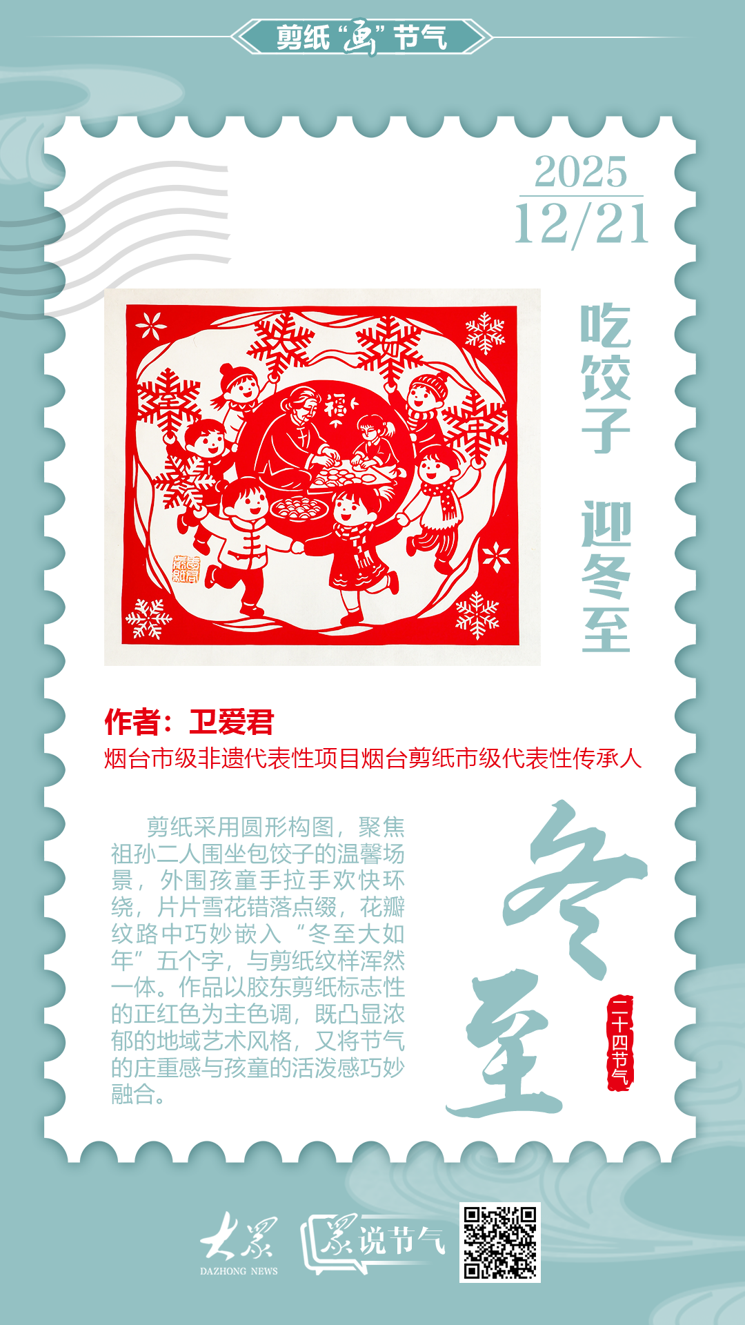 作品介绍:剪纸采用圆形构图,聚焦祖孙二人围坐包饺子的温馨场景,外围孩童手拉手欢快环绕,片片雪花错落点缀,花瓣纹路中巧妙嵌入“冬至大如年”五个字,与剪纸纹样浑然一体。作品整体以胶东剪纸标志性的正红色为主色调,既凸显浓郁的地域艺术风格,又将节气的庄重感与孩童的活泼感巧妙融合,让传统民俗的温度与韵味跃然纸上。