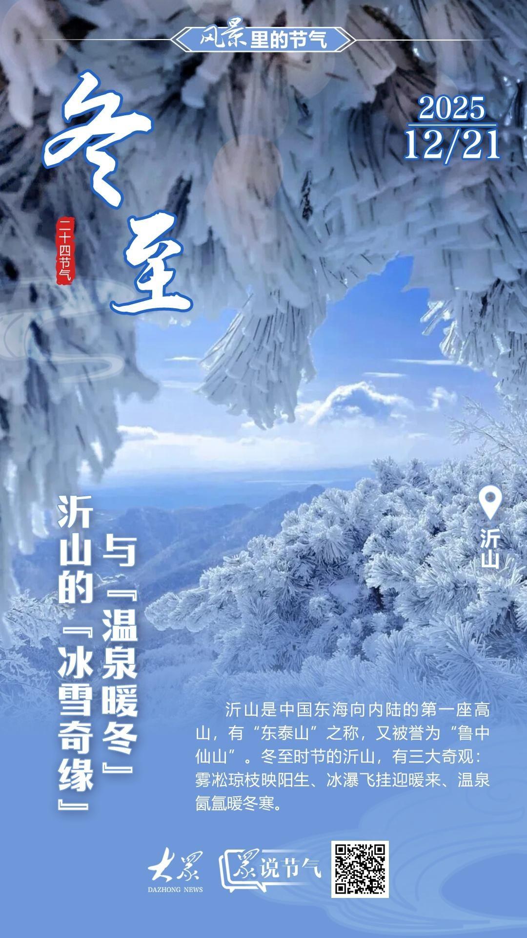 冬至时节的沂山,有三大奇观。雾凇琼枝映阳生:冬至前后,沂山迎来雾凇最佳观赏期,漫山遍野银装素裹,松针戴玉,树枝挂银,在阳光下闪烁着耀眼光芒,宛如仙境。冰瀑飞挂迎暖来:百丈崖瀑布凝结成层层叠叠的冰瀑,如白玉垂挂,气势磅礴。温泉氤氲暖冬寒:沂山脚下的温泉度假区,在零下的严寒中形成“云雾润蒸”的奇观,浸泡在温暖的泉水中,望着远处的冰雪世界,感受着泉水的温热,仿佛触摸到了冬至时节大地深处涌动的阳气。