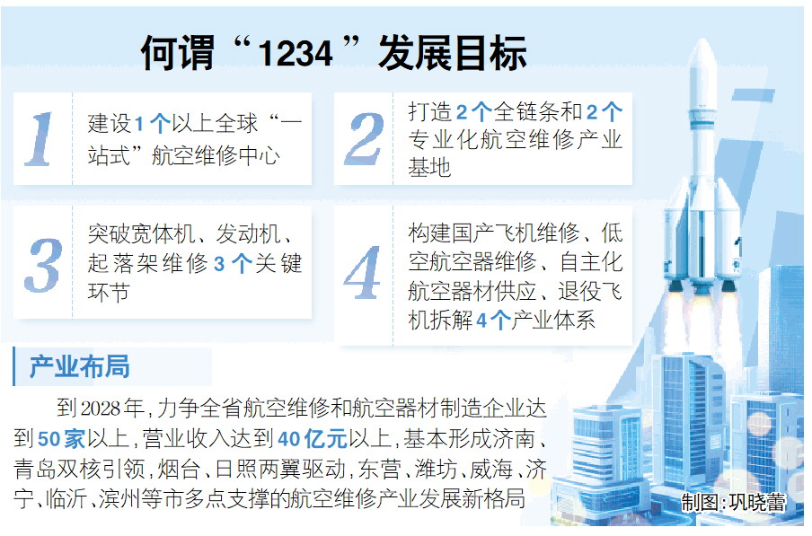 省交通运输厅副厅长廉波介绍,“1234”发展目标中的“1”是建设1个以上全球“一站式”航空维修中心,“2”是打造2个全链条和2个专业化航空维修产业基地,“3”是突破宽体机、发动机、起落架维修3个关键环节,“4”是构建国产飞机维修、低空航空器维修、自主化航空器材供应、退役飞机拆解4个产业体系,力争全省航空维修和航空器材制造企业达到50家以上,营业收入达到40亿元以上,基本形成济南、青岛双核引领,烟台、日照两翼驱动,东营、潍坊、威海、济宁、临沂、滨州等市多点支撑的航空维修产业发展新格局。为实现上述目标,《行动方案》部署实施四大重点行动,推进12项关键工作。推进措施中,明确建立对口服务机制,营造一流发展环境,强化财税支持引导,加快高端人才集聚,为航空维修产业高质量发展提供强力支撑。