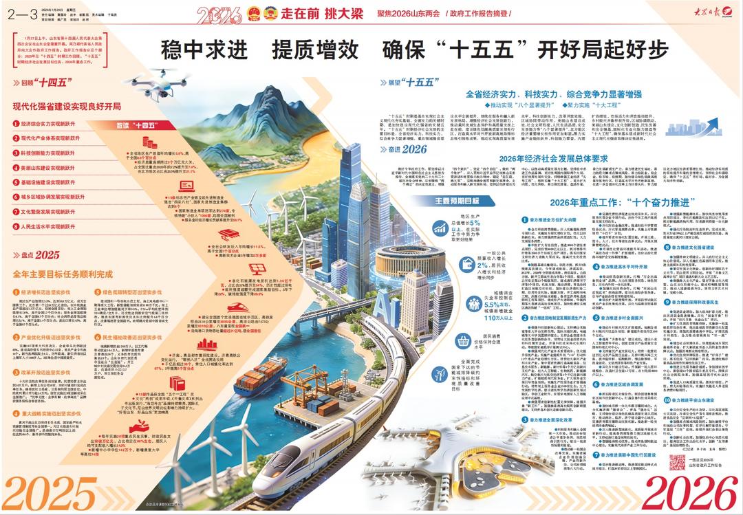 1月27日上午,山东省第十四届人民代表大会第四次会议在山东会堂隆重开幕。周乃翔代表省人民政府向大会作政府工作报告。政府工作报告分三个部分:2025年及“十四五”时期工作回顾、“十五五”时期经济社会发展目标任务、2026年重点工作。