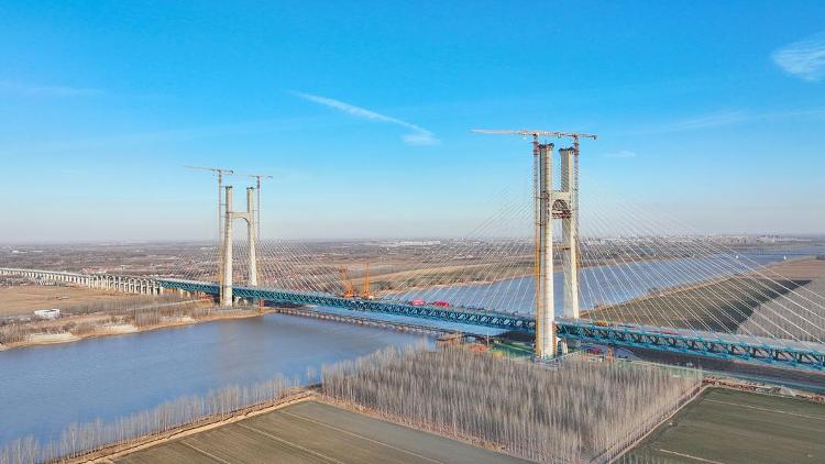 2025年12月31日,津潍高铁东营黄河公铁大桥主桥钢桁梁实现精准合龙。(资料片)