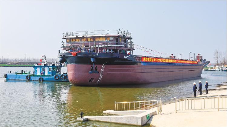 3月19日上午9点58分,山东新能船业有限公司(以下简称“新能船业”)为世界航运巨头法国达飞海运集团建造的182TEU(20英尺标准集装箱)纯电动力集装箱运输船(上图)在邹城成功下水。