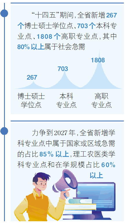 今年省政府工作报告中提出“集中要素资源,打造4个万亿级新兴支柱产业,壮大4个千亿级新兴潜力产业”。省委教育工委委员,省教育厅副厅长、新闻发言人王浩表示,将紧紧围绕这一布局,以服务产业需求为导向,全力推进学科专业调整优化,加快布局一批新兴交叉学科,重点建设一批省优势特色学科,超常布局一批急需学科专业,优化调整一批存量学科专业。力争到2027年,全省新增学科专业点中属于国家或区域急需的占比85%以上,理工农医类学科专业点和在学规模占比60%以上;到2030年,学科专业与现代化产业体系需求适配度达到95%以上,显著增强支撑区域经济社会发展的能力。