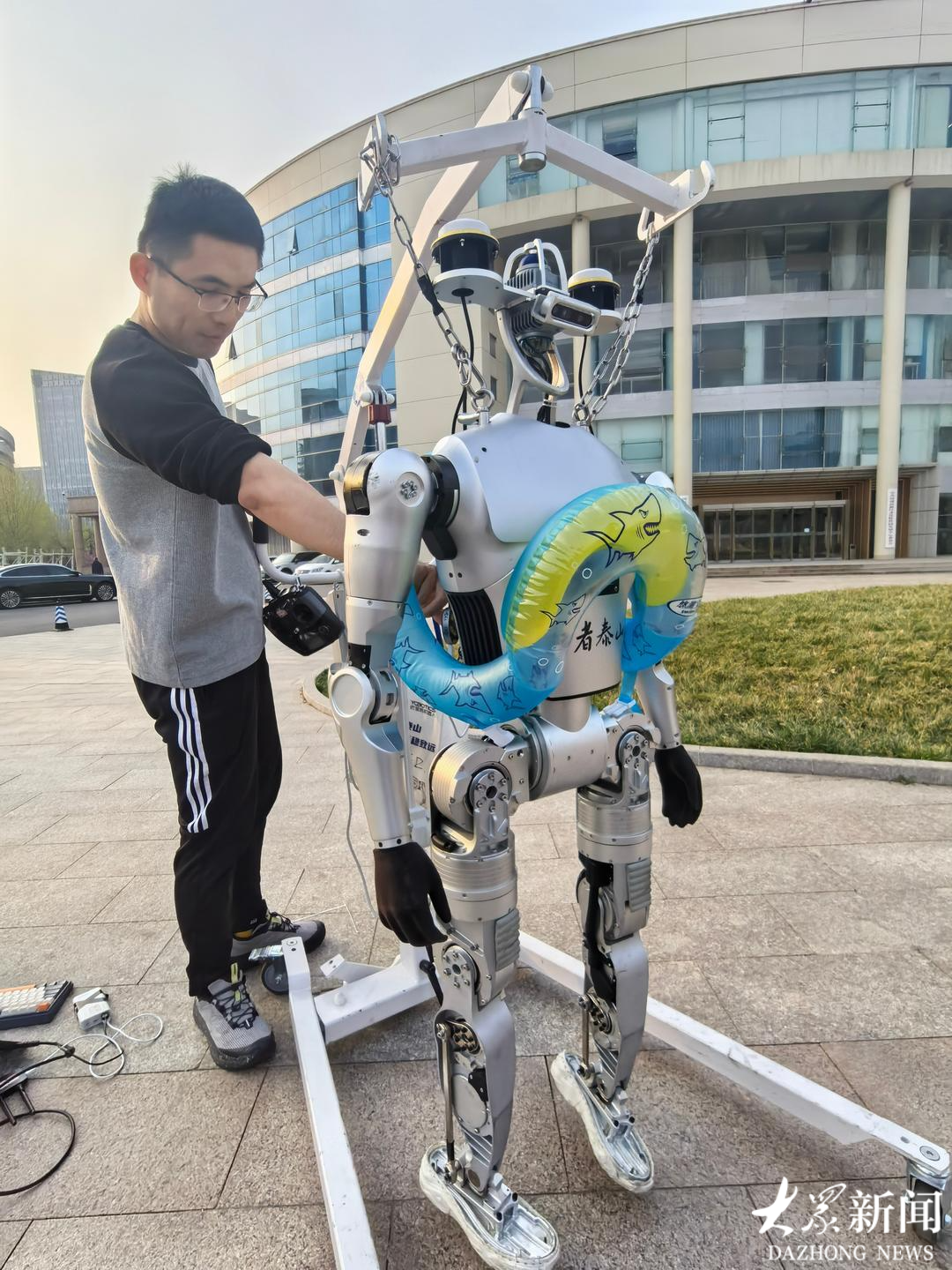 4月1日下午3点半,济南齐鲁软件园内,来自山东优宝特智能机器人有限公司(以下称“优宝特”)研制的人形机器人“行者泰山”,正在进行“特训”。