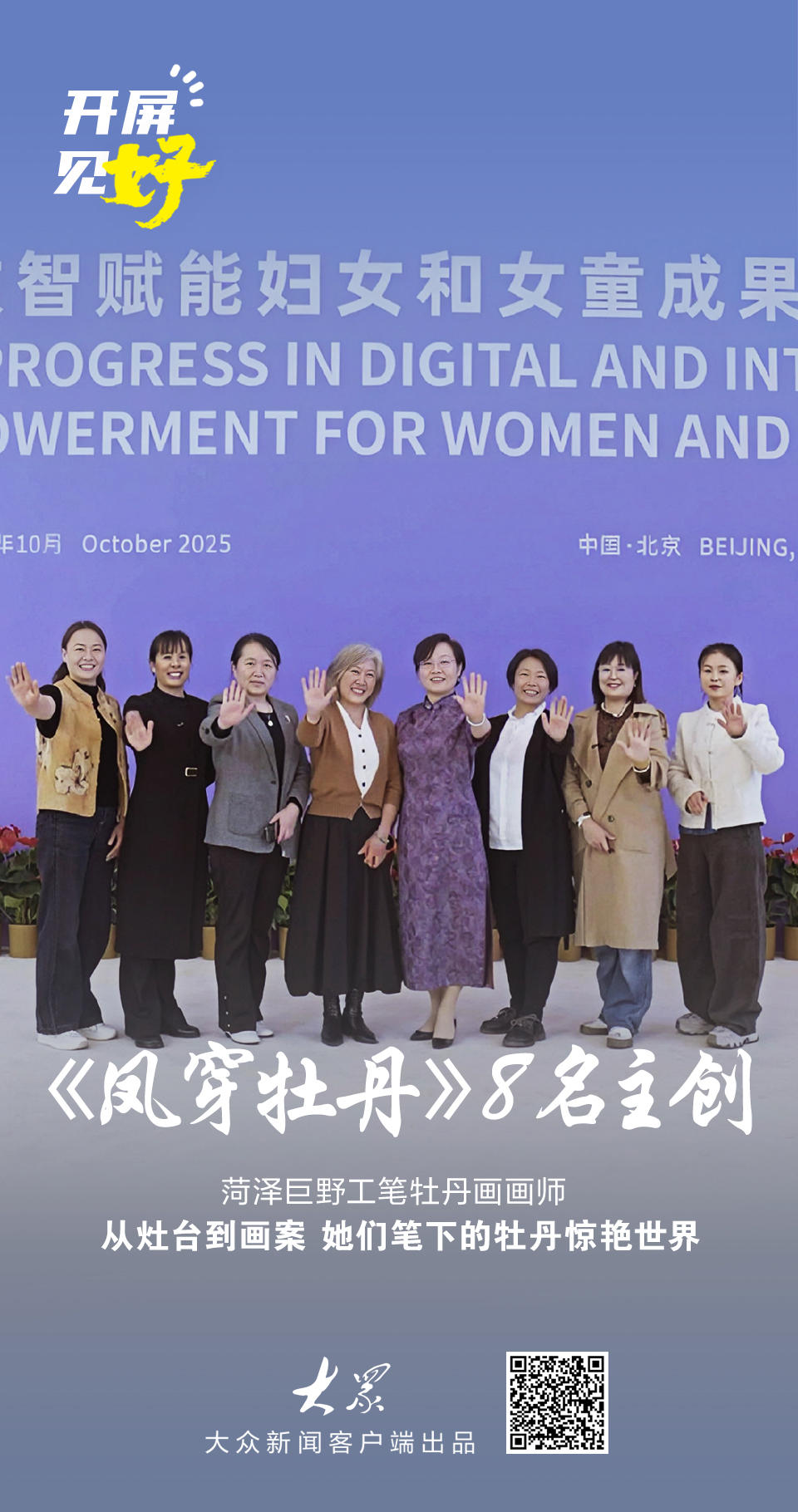 时间回溯到去年10月,《凤穿牡丹》在全球妇女峰会配套活动“数智赋能妇女和女童成果展”现场亮相。画作前,几位气质沉静的中国女性笑容温婉,与画中的华彩交相辉映——她们正是这幅画的主创:李巧玲、张雪云、常秀娟、洪晓雁、田琳琳、裴薇薇、张玉梅、胡咏梅。