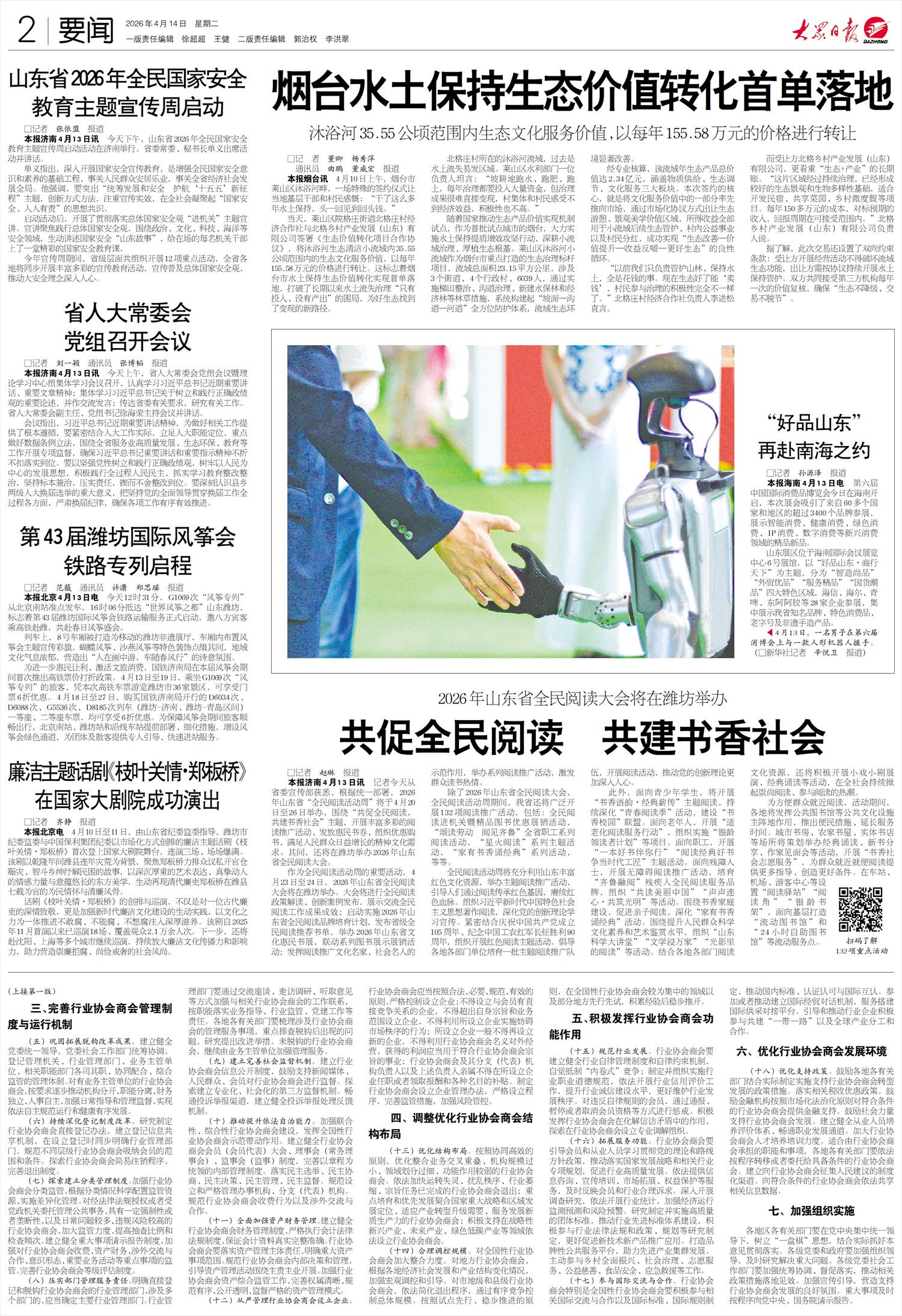 本报济南4月13日讯 记者今天从省委宣传部获悉,根据统一部署,2026年山东省“全民阅读活动周”将于4月20日至26日举办,围绕“共促全民阅读,共建书香社会”主题,开展丰富多彩的阅读推广活动、发放惠民书券、组织优惠购书,满足人民群众日益增长的精神文化需求。其间,还将在潍坊举办2026年山东省全民阅读大会。