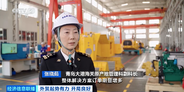 青岛大港海关原产地管理科副科长 张晓茹:一是产品向成套化、智能化升级,整体解决方案订单明显增多;二是市场更趋多元,东南亚、非洲、中亚增长最为迅猛,同时澳大利亚、欧洲等高端市场订单也在大幅提升,整体呈现量质齐升的良好态势。