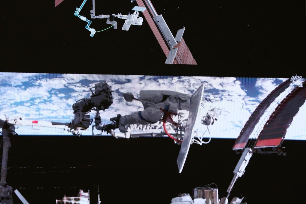 △这是2026年4月16日在北京航天飞行控制中心屏幕上拍摄的神舟二十一号乘组航天员武飞在舱外工作的画面。