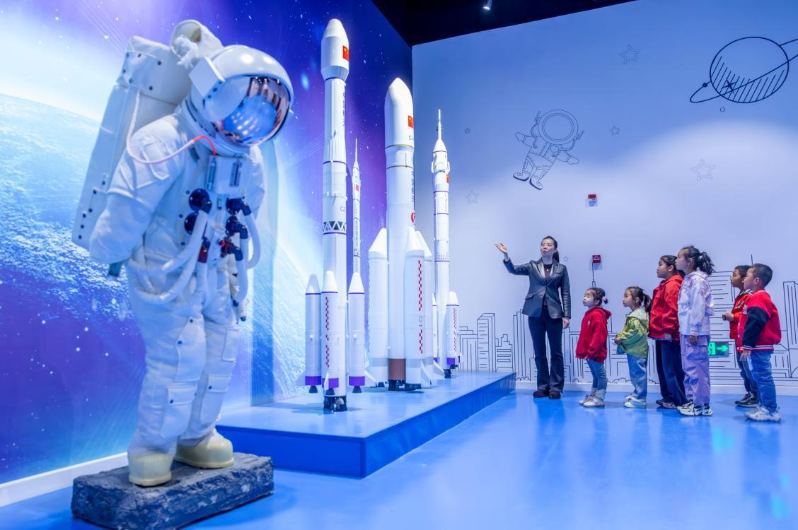 △2026年4月23日,甘肃张掖,孩子们在科技馆航天科普展厅近距离参观长征系列火箭模型。