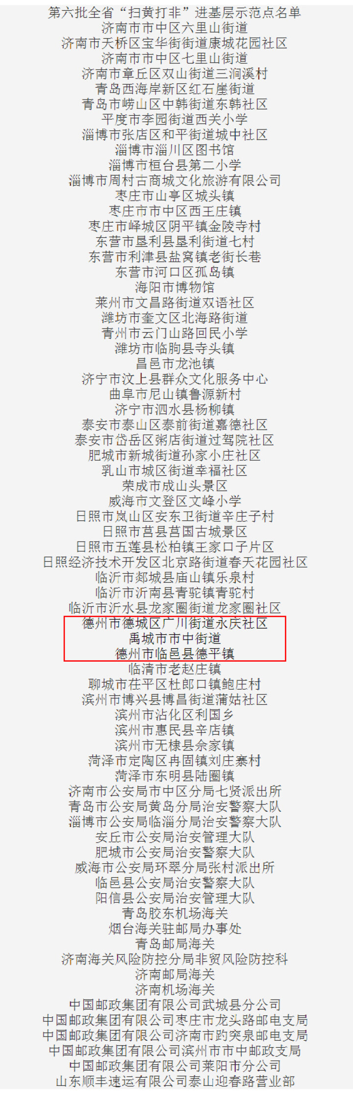 10月8日,山东省“扫黄打非”工作领导小组办公室公示第六批全省“扫黄打非”进基层示范点名单,德州3单位入选,分别为德城区广川街道永庆社区、禹城市市中街道、德州市临邑县德平镇。