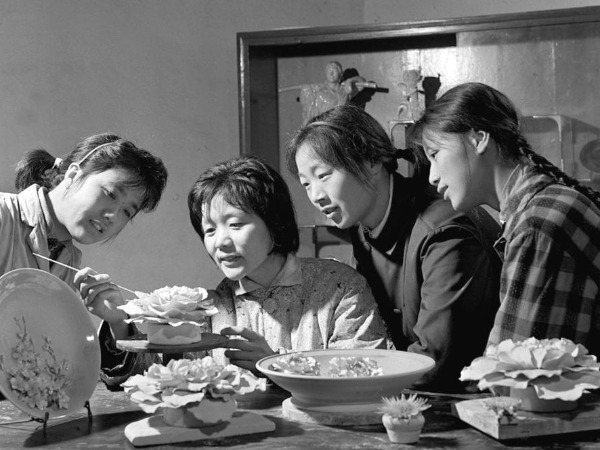 2000多年的冶陶史成就“千年瓷都”景德镇延绵千年的窑火,孕育瑰丽陶瓷文化↑1978年,景德镇陶瓷研究所技术人员(左二)和工人一起研究堆花技术。↑1978年,景德镇为民瓷厂工人生产日用瓷。↑1997年
