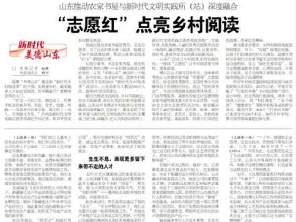 山东推动农家书屋与新时代文明实践所(站)深度融合“志愿红”点亮乡村阅读□本报记者赵琳本报通讯员邢宁随着“书香山东”建设和“新时代乡村阅读季”的开展,在我省乡村,越来越多人开始自觉阅读,用书籍敲开广袤精