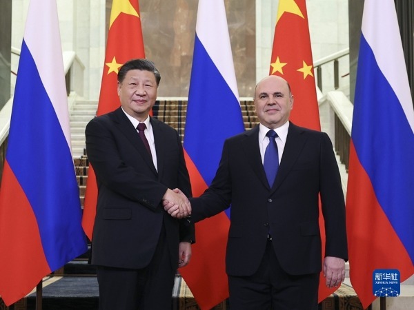 当地时间3月21日上午,国家主席习近平在俄罗斯联邦政府大厦会见俄罗斯总理米舒斯京。习近平说:“尊敬的米舒斯京总理,我很高兴同你结识。时隔三年多,再次访问友好邻邦俄罗斯,我倍感亲切。我这次访问俄罗斯,将