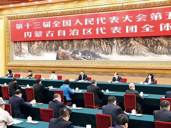 新时代党和人民奋进的必由之路※习近平 2022年3月5日,中共中央总书记、国家主席、中央军委主席习近平参加十三届全国人大五次会议内蒙古代表团的审议。新华社记者黄敬文/摄 回顾新时代党和人民奋进历程