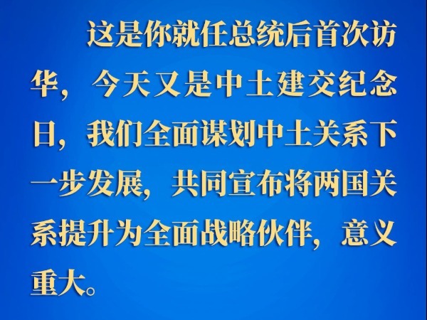 1月6日上午,国家主席习近平在人民大会堂同来华进行国事访问的土库曼斯坦总统谢尔达尔·别尔德穆哈梅多夫举行会谈。两国元首宣布,将中土关系提升为全面战略伙伴关系。会谈中,习近平主席就中土关系作出一系列重要