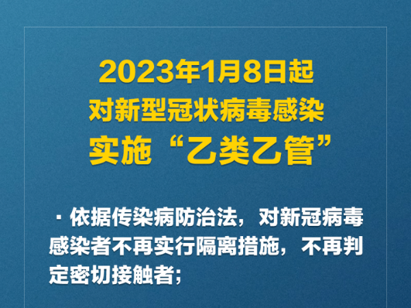 为进一步指导各地各部门平稳有序实施新型冠状病毒感染“乙类乙管”,根据《关于对新型冠状病毒感染实施“乙类乙管”的总体方案》有关要求,国务院联防联控机制制定了《新型冠状病毒感染“乙类乙管”疫情监测方案》《新型冠状病毒感染“乙类乙管”检测方案》《重点人群、重点机构、重点场所新型冠状病毒感染“乙类乙管”防控指引》《新型冠状病毒感染“乙类乙管”个人防护指南》《新型冠状病毒感染“乙类乙管”防控培训方案》。