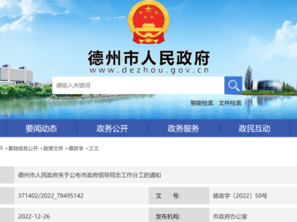 12月26日,德州市人民政府发布《关于公布市政府领导同志工作分工的通知》,对市政府领导同志工作分工进行公布。