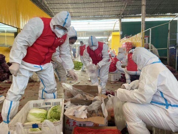 12月1日下午3时许,德州市义工志愿者联合会的50余名志愿者正在分拣爱心蔬菜包,这是由山东黑马集团捐赠的100万斤蔬菜,将分装7万余份蔬菜包送往管控在家的德城区百姓家中,一场爱心蔬菜保供行动正在德州接力上演。