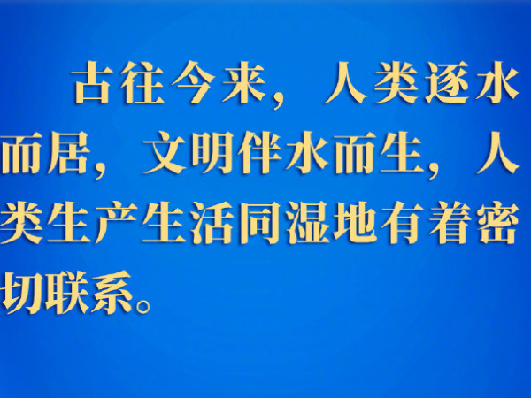 11月5日下午,国家主席习近平以视频方式出席在武汉举行的《湿地公约》第十四届缔约方大会开幕式并发表题为《珍爱湿地守护未来推进湿地保护全球行动》的致辞。 习近平指出,古往今来,人类逐水而居,文明伴水而