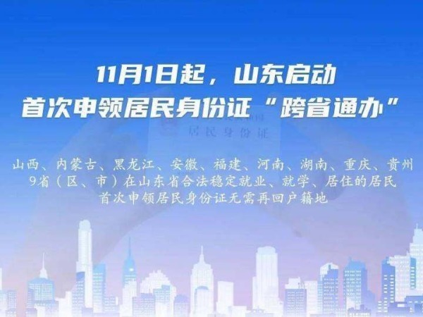 根据公安部部署,山东自11月1日正式启动与山西、内蒙古、黑龙江等9省(区、市)间首次申领居民身份证“跨省通办”,10省(区、市)群众首次申领居民身份证无需再回户籍地。