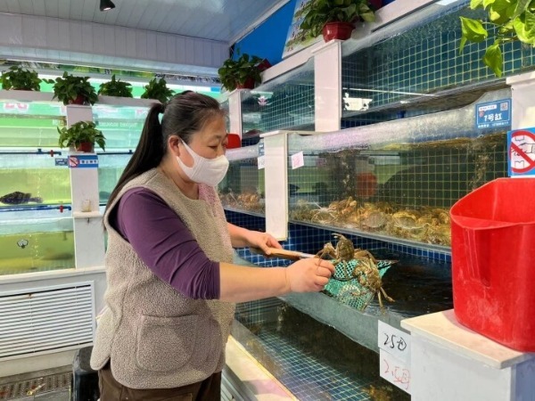 水产市场老板卖力吆喝着。金秋十月,又到了吃螃蟹的最佳时节。10月25日,记者走访城区多家水产市场了解到,大闸蟹、海蟹价格降了,购买螃蟹的市民也逐渐多了起来。