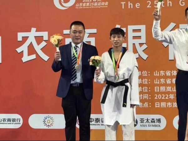 2022年7月14日,德州跆拳道运动员韩涛在山东省第25届运动会上敢打敢拼、发挥出色,摘得男子跆拳道甲组54公斤级比赛银牌,为我市夺得首枚奖牌。