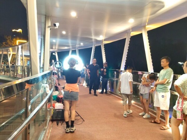 7月4日晚,记者来到文化路天桥上看到,两名身着超短裙的年轻女性正在网络直播。两人边跳边唱,时不时还邀请围观市民扫码关注。表演间歇,主播还会与线上网友们互动,如“飞吻求关注”“榜一大哥刷礼物”“你点什么我跳什么”等等,当直播间出现网友礼物时,女主播更是连声尖叫甚至于爆粗口。