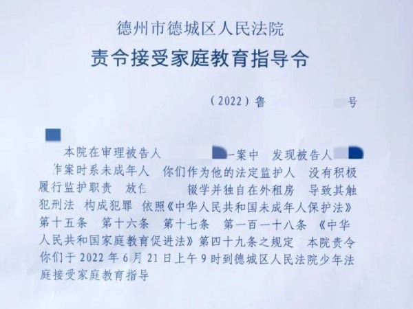 6月14日,德城区法院向一起刑事案件中的未成年人父母发出了一份《家庭教育指导令》,责令被告人父母切实履行监护职责,承担起家庭教育的主体责任。