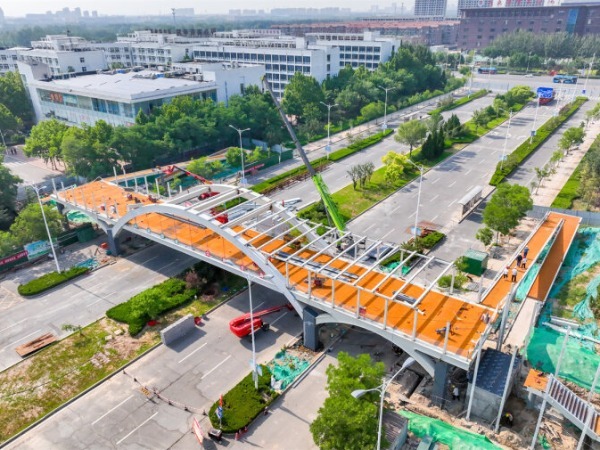 6月8日,记者在德州职业技术学院过街天桥项目现场看到,该项目已完成所有钢柱安装,以及桥面板吊装。