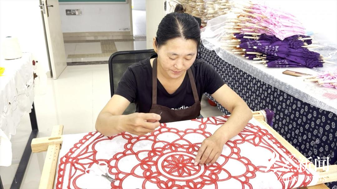 捻、拉、提……9月23日,在泰安市岱岳区大汶口镇的百代丽工艺伞厂内,十几名绣娘熟练操作手中的针线。针起线落,一把把精美、镂空、纹样繁复的花边伞渐渐成型。绣娘熟练操作手中的针线绣制花边伞。“我们的花边伞