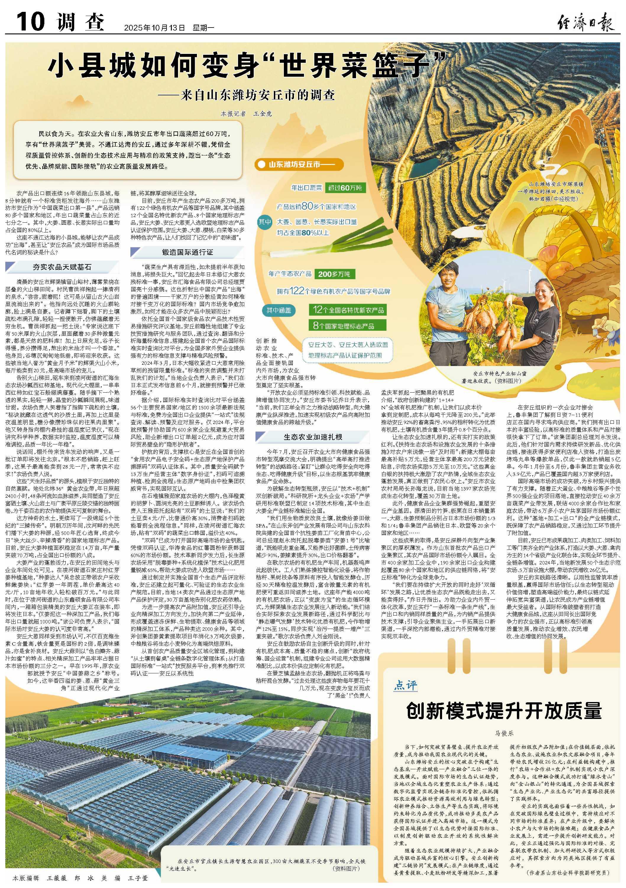 民以食为天。在农业大省山东,潍坊安丘市年出口蔬菜超过60万吨,享有“世界菜篮子”美誉。不通江达海的安丘,通过多年深耕不辍,凭借全程质量管控体系、创新的生态技术应用与精准的政策支持,蹚出一条“生态优先、